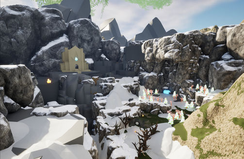 Two major challenges I faced throughout the development of this level were properly capturing verticality of a mountain path and crafting an environment that was fit with both the icy and spring versions of the level. I started with this vista in my head of the player over looking a canyon and a massive temple off in the distance. I really wanted the player to feel like they were progressing a great distance through the mountains. I went through many different iterations in the early phases and eventually introduced a cave system that allowed for some rapid height increases.