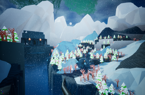 The environment changes progressively throughout the level. Once a puzzle is completed, only the surrounding area melts and changes from icy to spring weather. To make this easier to implement and avoid tediously plugging each object into an array I set up a system that checks for tagged items that are organized in my outliner and automatically adds them to the array for that instance of the Season Change blueprint. Once activated, this system will swap materials, reveal foliage, adjust values within post processing volumes to affect lighting, scale meshes to melt snow, and deactivate snow vfx systems. For the finishing touches, one of our programmers was able to hook up an existing aura vfx and set it to change the materials for any object within the aura as it expanded.